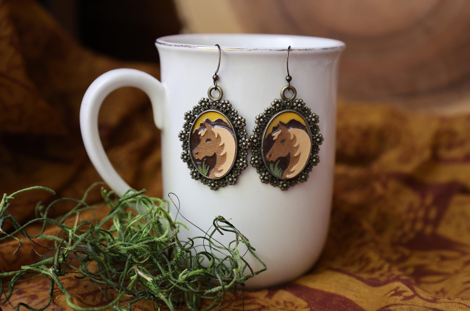 这些分层剪纸耳环以 Beau the Horse 为特色,镶嵌在花卉边框中,表面采用古铜色饰面。黄铜耳环钩不含铅和镍,并配有透明硅胶耳环背。灵感来自大自然,手工制作,充满爱意。设计尺寸为 18x25 毫米,也可作为胸针和吊坠。详情请参阅其他列表。